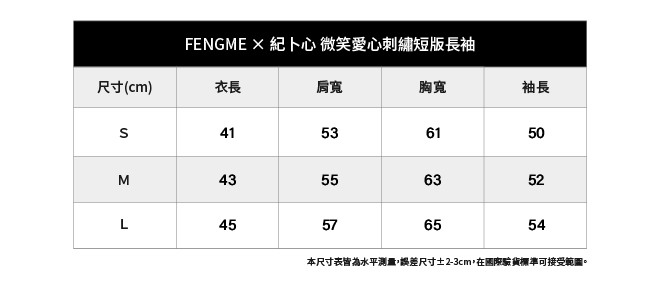 以微笑和紅色愛心為主題,散發著溫馨和愉悅感;採用FENGME經典短版長袖的版型,並運用精緻的刺繡工藝,呈現簡約而具有設計感的風格。